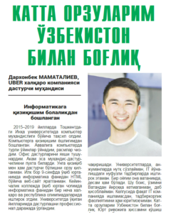 “Yangi O‘zbekiston” gazetasining 2022-yil 6-dekabr (248-son) sonida Toshkent shahridagi Inha universiteti bitiruvchisi Darkhonbek Mamataliyev ...