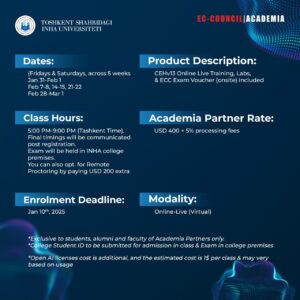 Biz sizni EC-Council tomonidan faqat Toshkent shahridagi Inha universiteti talabalari, bitiruvchilari va o‘qituvchilari uchun tashkil etilgan Certified Ethical Hacker (CEH) sertifikatlash kursida ishtirok etishga taklif qilamiz.