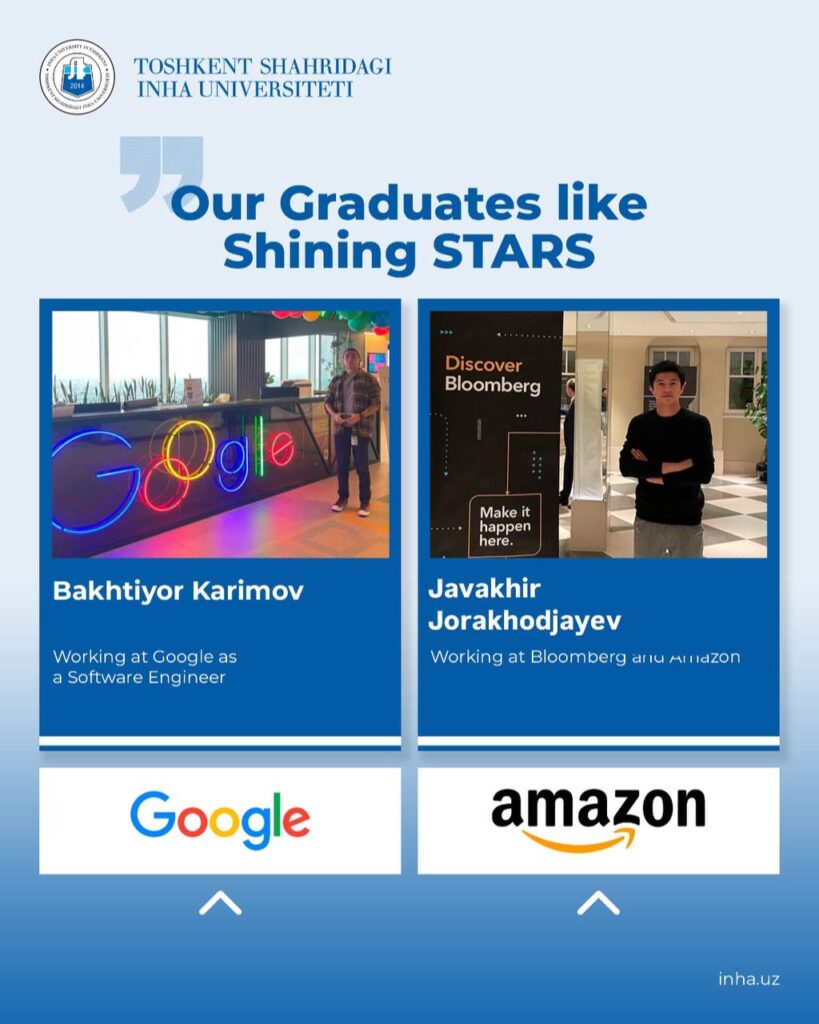 Toshkent shahridagi Inha universiteti bitiruvchilari nafaqat O‘zbekiston, balki dunyoning yetakchi kompaniyalarida faoliyat yuritib, biz har bir talabada rivojlanayotgan innovatsion yondashuvlar va yetakchilik qobiliyatlarini singdiramiz.