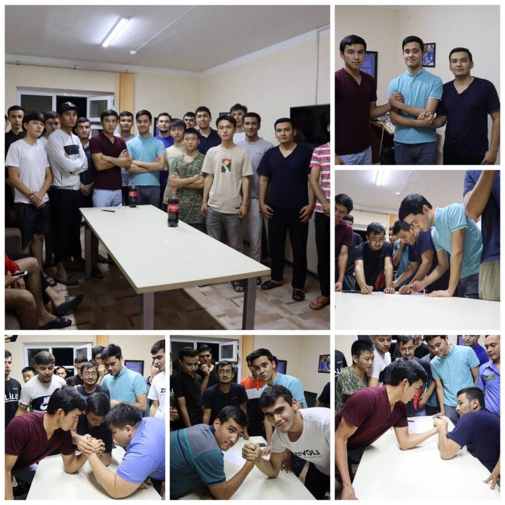 TShIU talabalar turar joyida yashovchi talabalarni bo’sh vaqtlarini mazmunli o’tkazish va O’zbekiston Respublikasi Prezidentining 5 ta muhim tashabbuslari ijrosini ta’minlash maqsadida talabalar o’rtasida, sportning «Arm Wrestling» sport musobaqasi tashkil etildi.