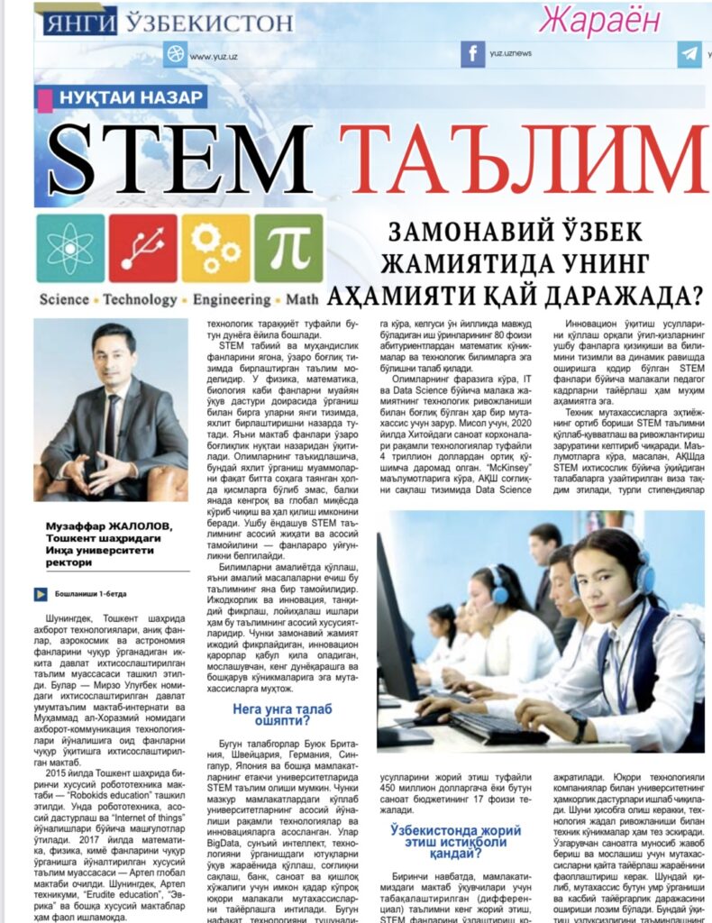 2023-yil 10-fevral kuni «Yangi O‘zbekiston» (№ 28) gazetasi tomonidan Toshkent shahridagi Inha universiteti rektori Muzaffar Djalalovning «STEM ta’lim zamonaviy o’zbek jamiyatida uning ahamiyati qay darajada?» mavzusidagi qiziqarli va dolzarb maqolasi nashr etildi.